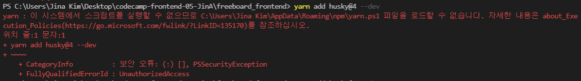 [husky error] yarn : 이 시스템에서 스크립트를 실행할 수 없으므로 C:\Users\Jina Kim\AppData\Roaming\npm\yarn.p