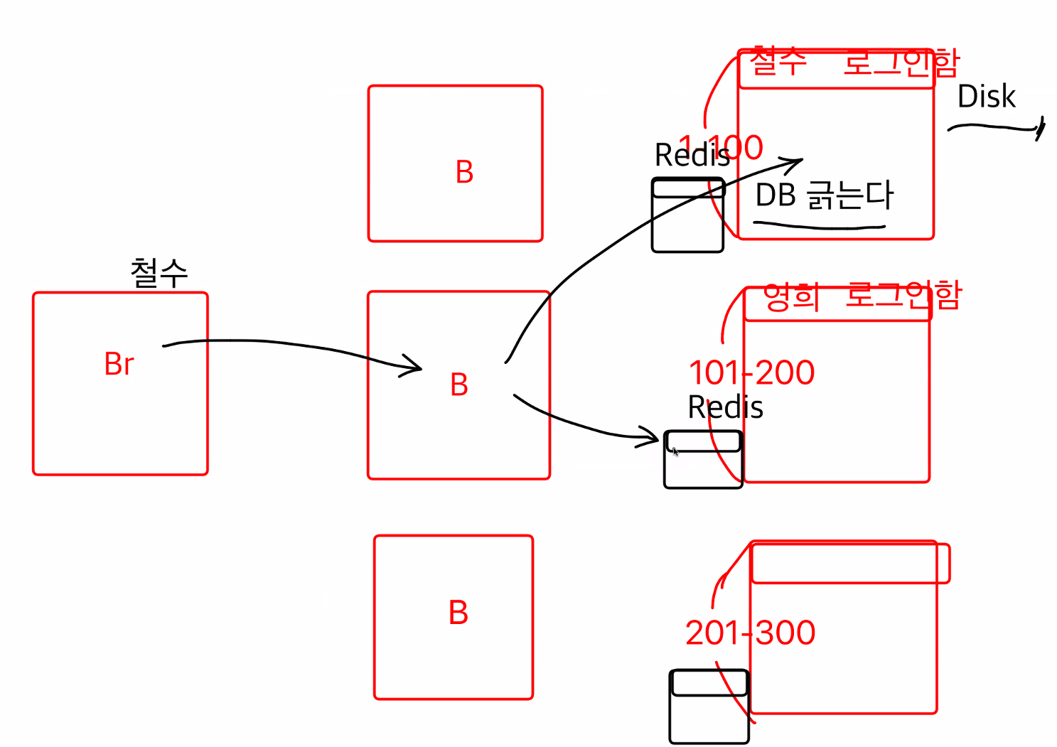 속도가 느리기 때문에 디비 앞에 Redis를 두고 여기에 로그인 정보를 저장합니다.